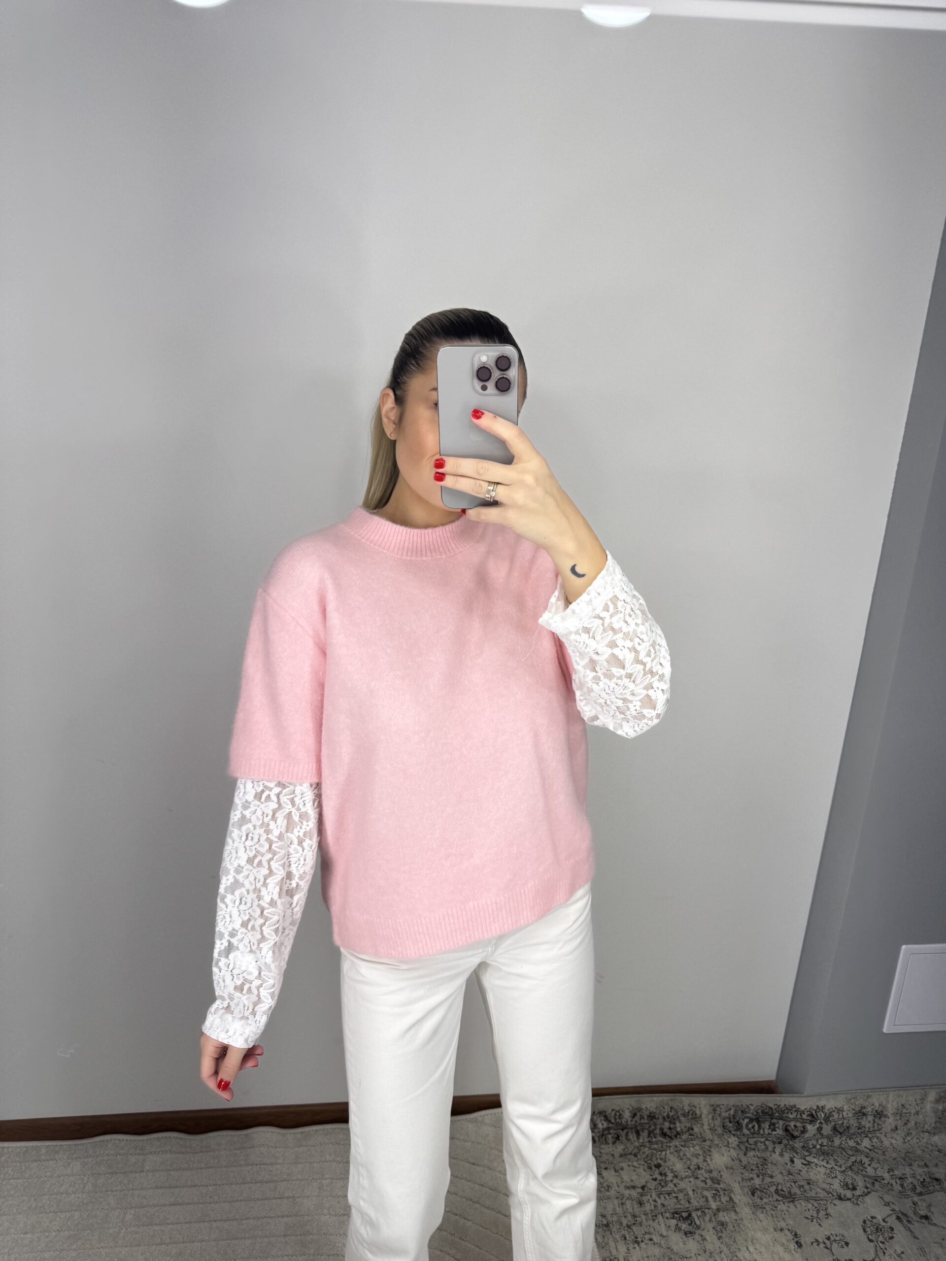 Rausvas megztinis su puošniomis neriniuotomis rankovėmis