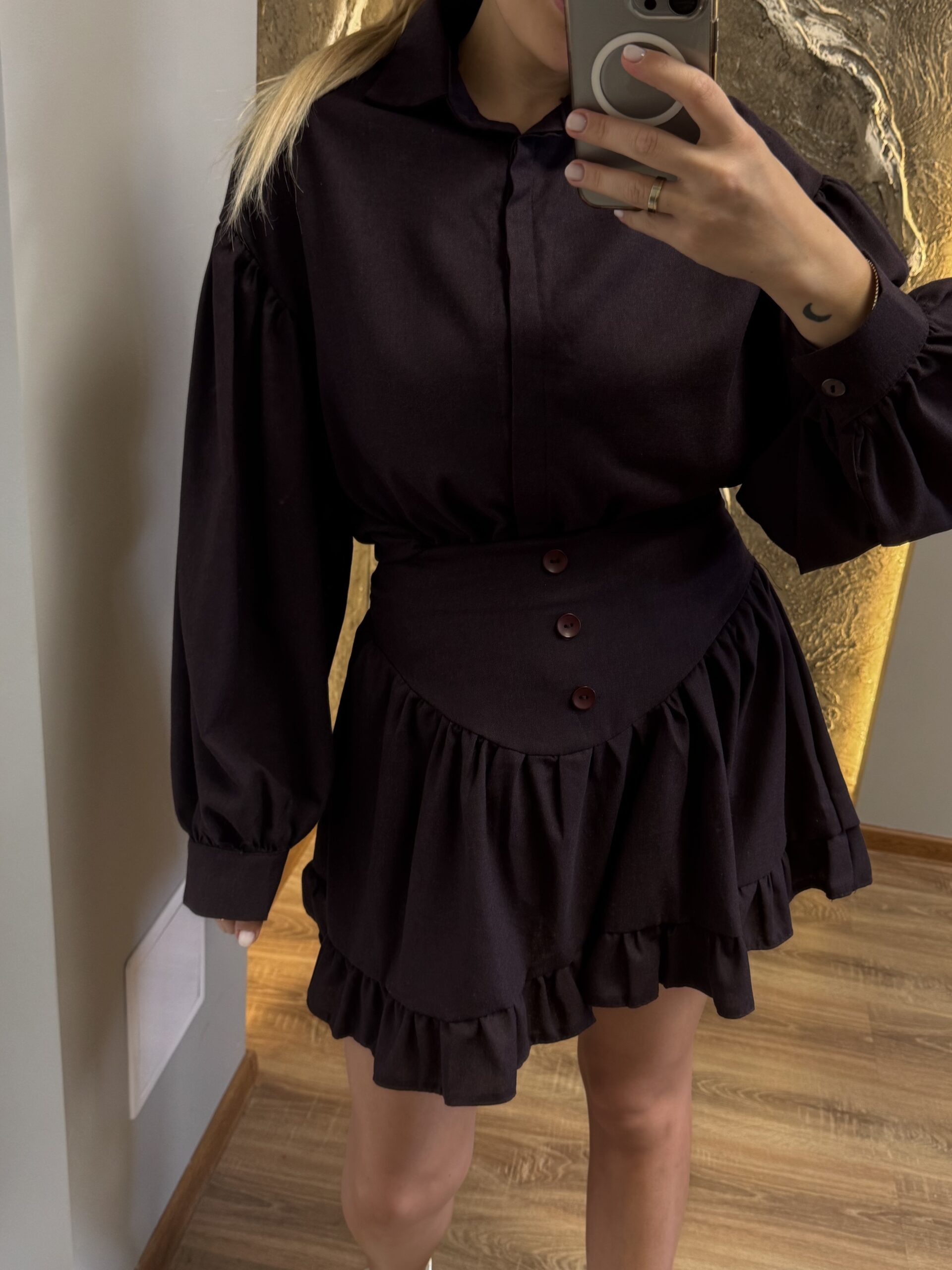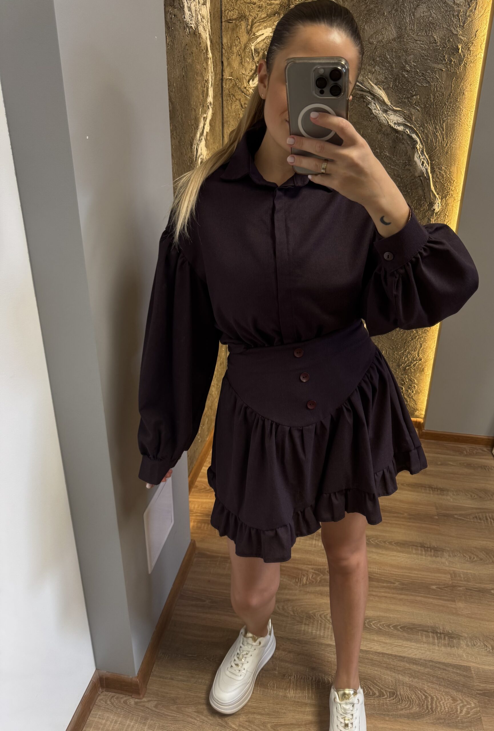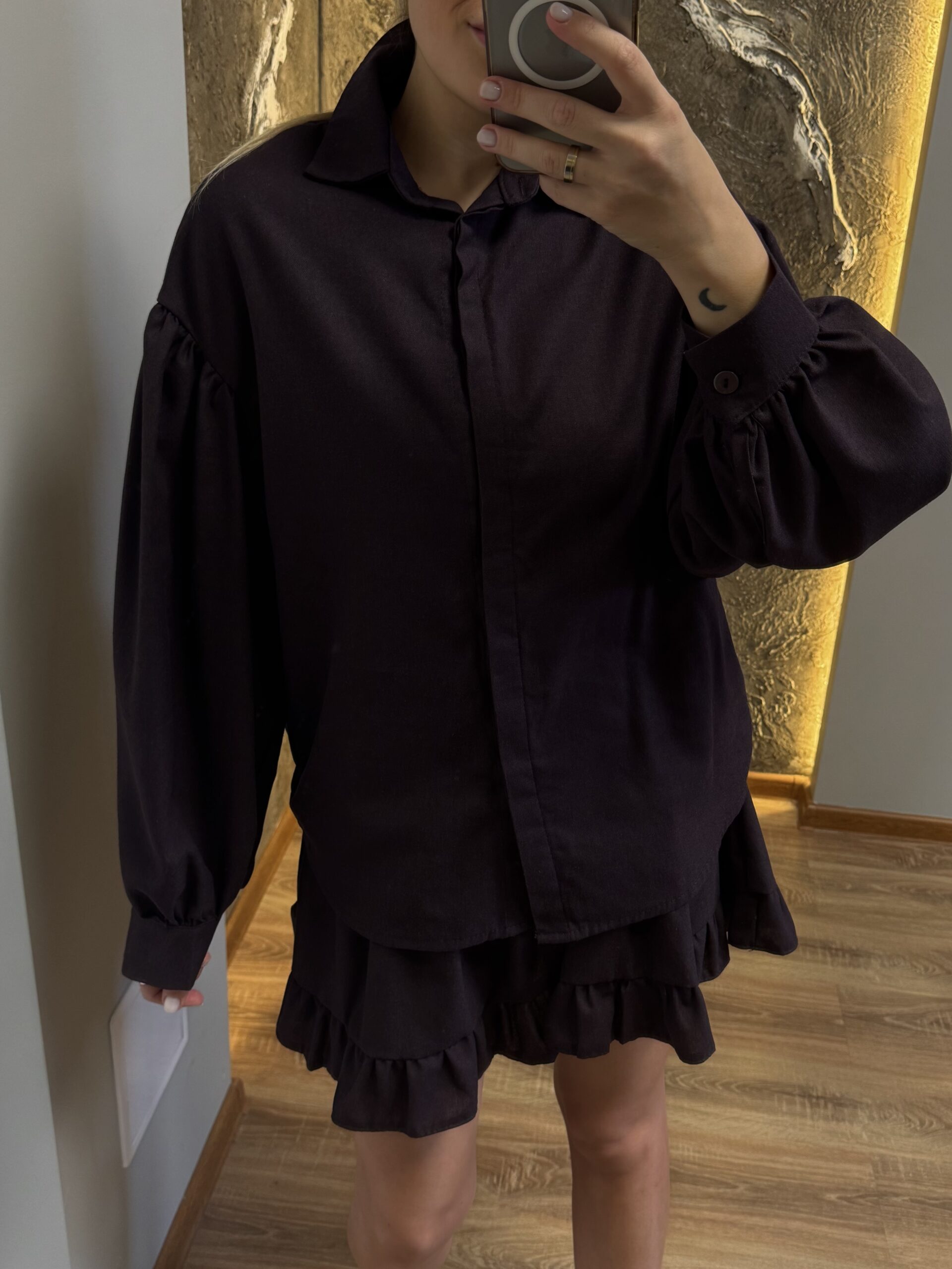 Tamsios spalvos kostiumėlis – marškiniai + sijonas